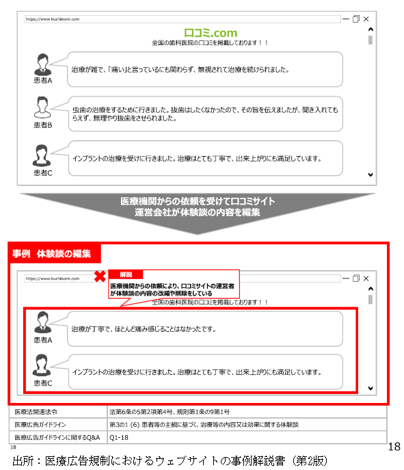 例えば体験談や口コミに関しては、治療の内容や効果に関するものであって誘引性が認められれば、規制対象となるため医療機関のホームーページ等には掲載できません。一方で、口コミは患者にとって重要な情報収集手段です。医療機関と関係のない第三者のウェブサイト、例えば医療機関検索サイトや口コミサイトなどは基本的に規制対象外で、口コミや体験談を載せることができます。しかし、そこに医療機関の意向が入り、依頼によって口コミを取捨選択したり編集したりすれば、誘引性が生じて規制対象となります。直接的な関与でなくても、サイトの運営に医療機関が出資している場合も同様です。