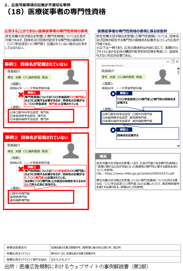 以上のように医療広告の規制内容は複雑で、忙しい医療現場において、厚労省からの通知等をつぶさに読んで理解することはなかなか難しいのではないでしょうか。そこで、ぜひ活用してほしいのが「事例解説書」です。具体的な事例がないと分かりにくいことから、21年に初版が作成されています。その後、実際の違反事例や周知が必要な事例などを踏まえ、23年に改訂版が公開されました。また、医療広告規制に関するQ&A集も18年に作成され、その後22年に改訂されています。こうした資料などは、厚労省のサイトの医療広告規制に関するページに掲載されています。