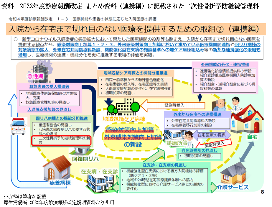 2022年度診療報酬改定で大腿骨頸部骨折の患者を対象とする骨粗鬆症の治療への評価として、二次性骨折予防継続管理料が新設された。この管理料は、手術を行った病院が二次性骨折予防の取り組みを行い管理料1の算定をしなければ、後方病床やかかりつけ医が二次性骨折予防の取り組みを行ったとしても管理料2・3を算定できない点に特徴がある。二次性骨折予防継続管理料は、単に骨粗鬆症の治療に対する評価ではなく、骨折リエゾンサービスの取り組みを評価するものである。脆弱性骨折の患者に対する骨粗鬆症の治療開始率の向上を図るだけでなく、地域の医療機関が連携することにより治療継続率の向上を図ることが期待されている。厚生労働省の改定説明のまとめ資料「連携編」で、二次性骨折予防継続管理料に言及していることからも分かるように、連携を強く意識すべき取り組みである=資料=。