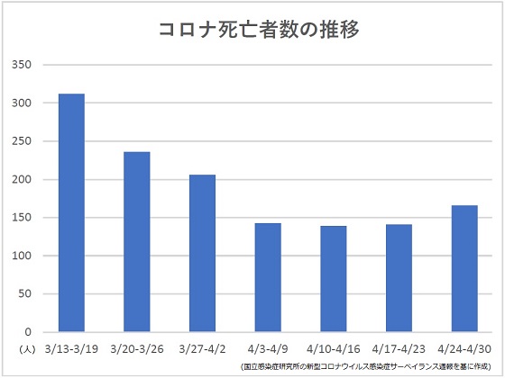 国立感染症研究所は8日、新型コロナウイルス感染症サーベイランス週報(第17週、4月24-30日)を公表した。第17週の死亡者数は前週比25人増の166人で、2週連続で増加した。新規の入院例も「微増傾向」と指摘している。【新井哉】