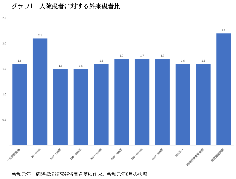 グラフ1は入院患者に対する外来患者比を病床規模・機能別に見たものであり、最も高いのが特定機能病院で、次いで100床未満となる。19年6月のデータであるためコロナの影響は受けていない。