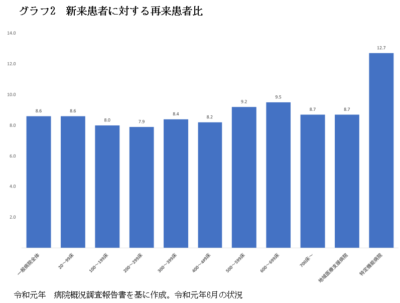 さらにグラフ2は新来患者に対する再来患者の比であり、特定機能病院が突出している状況を確認できる。