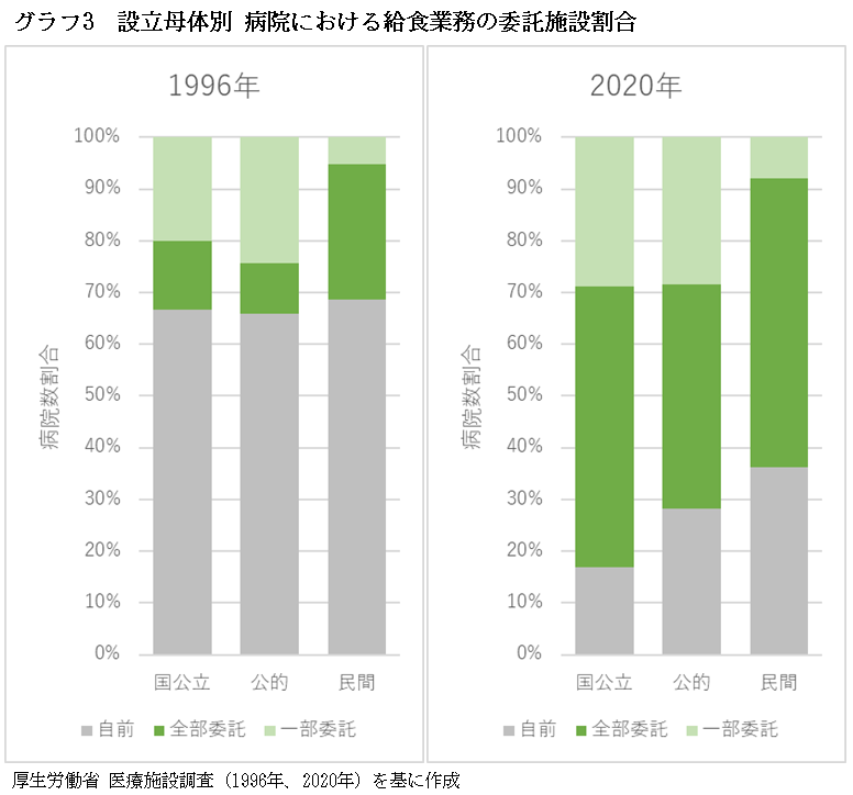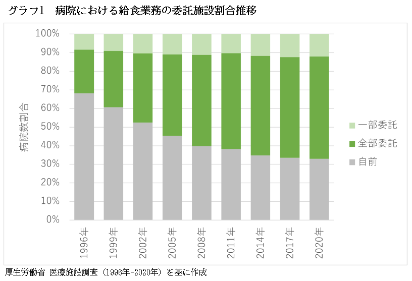病院における患者給食業務は、2010年以前までに委託への切り替えが急速に進んだ=グラフ1=。10年代以降、自前・委託の比率に大きな変化はないが、直近20年の調査結果では約3分の2の病院で委託(全部委託、一部委託の合計)になっている。