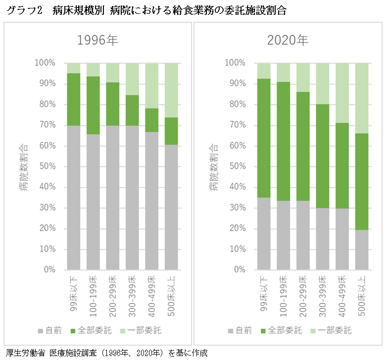 このような課題は、病床規模に関係なく共通である。そのため、病床規模別の委託状況について1996年と2020年を比較すると、病床規模によらず、自前が大幅に減り、全部委託が増えている=グラフ2=。