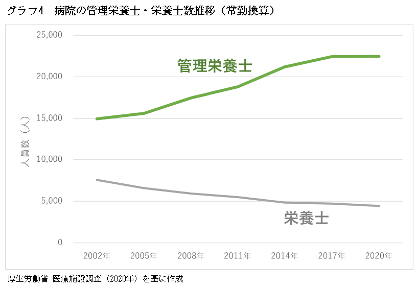 病院に勤務する管理栄養士はこの20年弱で1.5倍に増えた一方、栄養士は3分の2に減った。=グラフ4=。