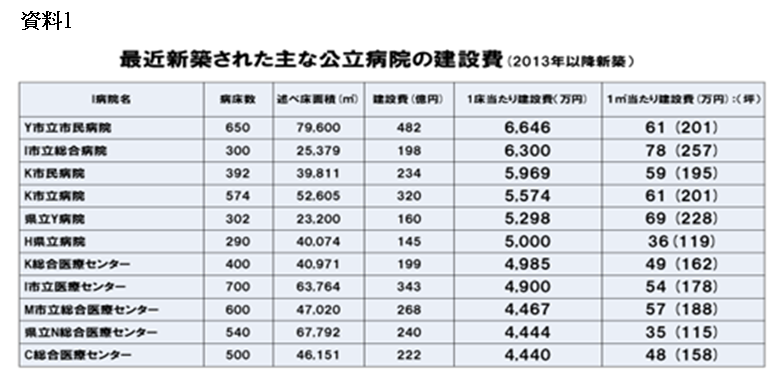 実際、東日本大震災後の公立病院の新築事例で、1床当たり5,000万円以上の建築費の病院も見られます(参考:公立病院は平均約3,500万円、民間病院は約1,600万円、公的病院は両者の中間)。資料1は各病院のホームページで公表されているものから筆者がまとめたものです。 (残り4230字 / 全4991字) 次回配信は6月9日5:00を予定しています