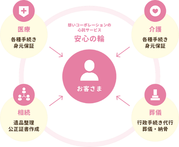 いわゆる“争続”を回避するため、生前元気なうちに終活をしようとする高齢者は増えている。“争続”以外にも、「遠方にいる子どもに迷惑を掛けたくない」「入院が必要になった時に身元を保証してくれる身内がいない」など終活を考えるきっかけはさまざま。心託サービスは、今後考えられる事を、自分が元気なうちにトラブルに発展しないように掛ける保険のようなもの。
