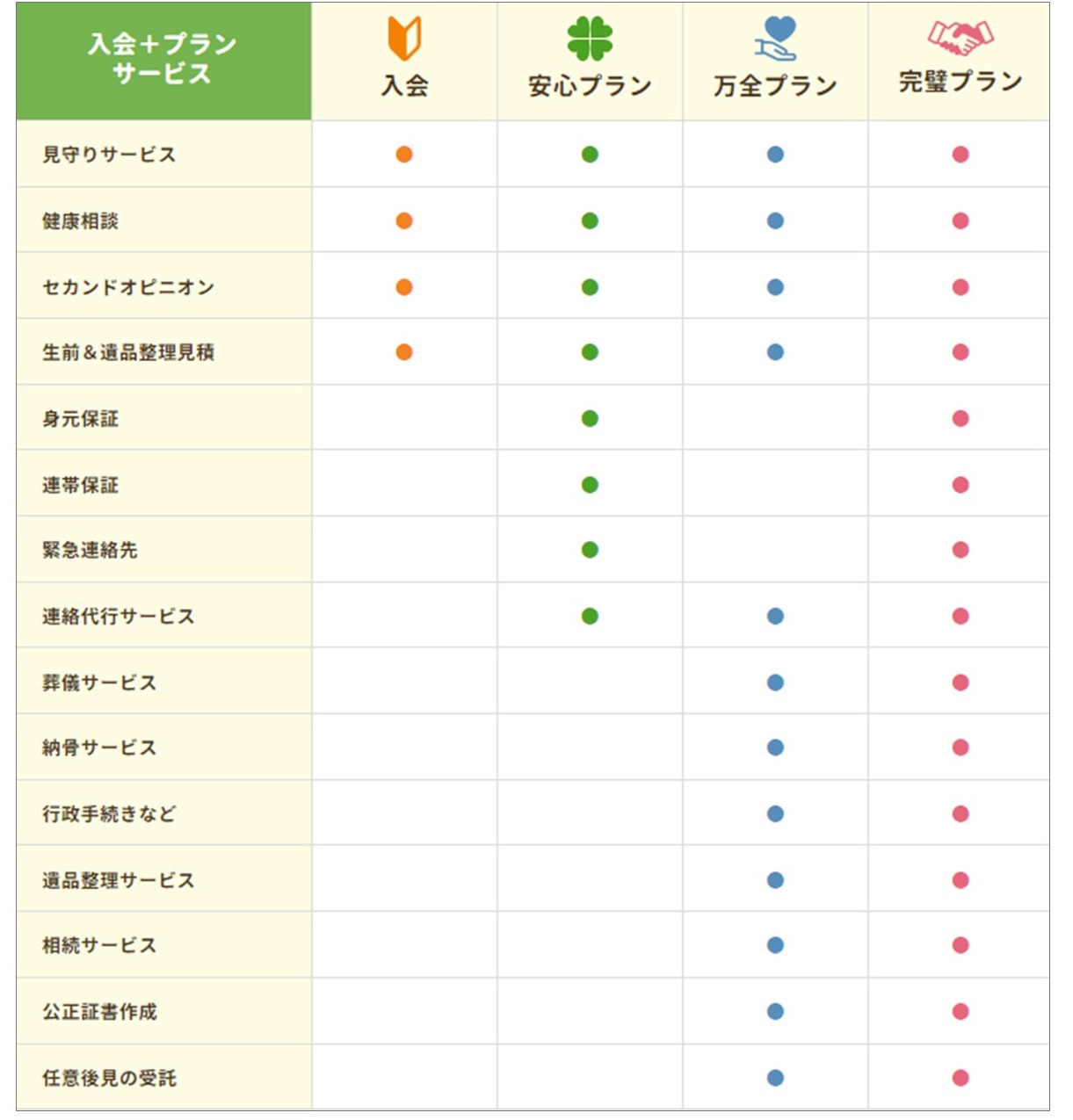 プランは3つ。身元保証を中心とした「安心プラン」、葬儀や納骨、遺品整理など、死後の対応を中心とした「万全プラン」と、この2つを合わせた「完璧プラン」がある。利用者は、それぞれに合ったプランを選択し、一括して料金を支払う仕組み。その後、仮に施設の利用料などの滞納があれば連帯保証として清算も行われるため、滞納者に対して内容証明などを送るという対応からは解放される。