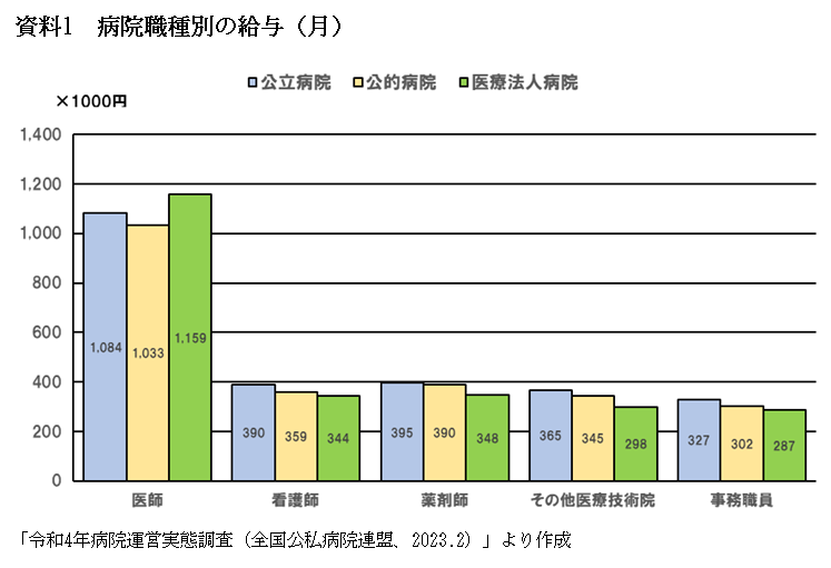 資料1は病院における職種別の給与費を公立病院、公的病院、医療法人病院で比較したものです。医師以外の職種では、公立病院に勤務する職員の給与費が公的病院、医療法人病院に勤務する職員より高額であることが分かります。特に看護師、事務職員の給与の差が大きいことが特徴です。病院職員の中でも、ほぼ過半数を占めている看護師の給与費は医業支出の中で大きな割合を占めています。