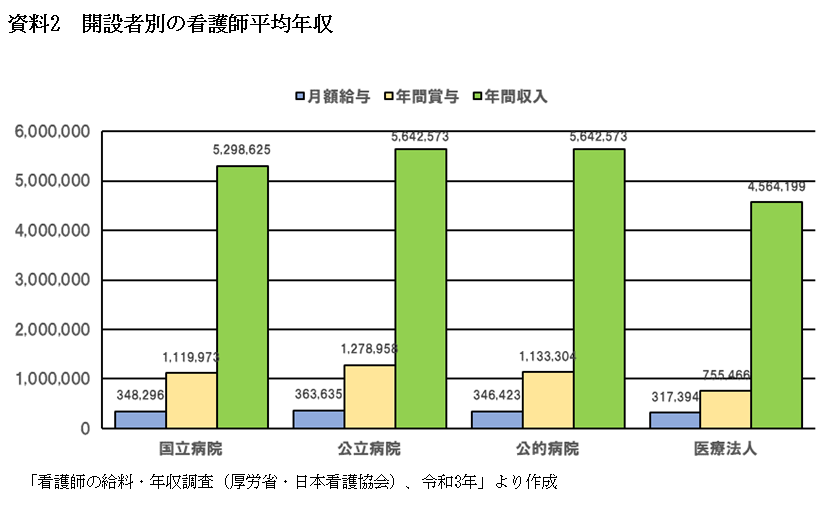 そこで、開設主体別の看護師の年収について見たものが資料2です。月額給与(公立病院は毎年必ず昇給:月当たり6,000-7,000円)、年間賞与(公立病院は通常、月間給与のほぼ4カ月分)共に公立病院に勤務する看護師が最大で、当然ながら年間収入も最大になっており、特に民間病院とは大きな差が認められています=資料2=。