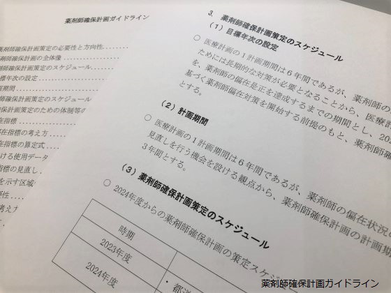そのため、都道府県はこの指針に基づいて薬剤師確保の取り組みを進める必要がある。取り組みに当たって第8次医療計画における薬剤師確保計画(期間は原則3年)を23年度に策定し、これに沿って薬剤師偏在対策を24年度に開始する。