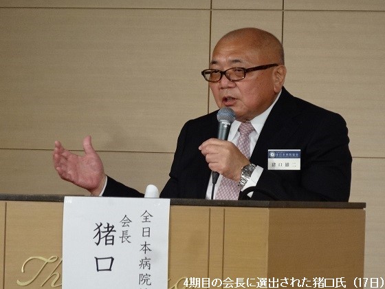 全日本病院協会(全日病)は17日の定時総会で、猪口雄二会長の再選を決定した。副会長5人の続投も決まり、4期目の猪口執行体制がスタートした。ただ、猪口氏は続投が決定した後のあいさつで、「いつまでも同じ人間が会長職に就くというのは組織の新陳代謝上よくない」とし、今期(2年間)限りで会長職を退く意向を表明した。【松村秀士】