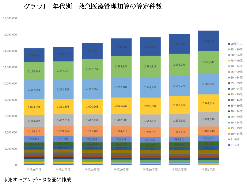 一方で、より重症度が高いと予想される救急車搬送入院や救急医療入院はそれほど減少していなかった。ただ、全国の救急医療管理加算の算定状況を見ると増加傾向にあり、特に75歳以上が60%を占めるという実態がある=グラフ1=。