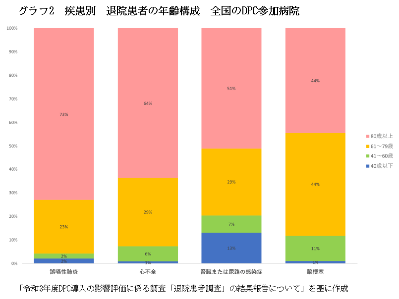 今後増加すると予想される高齢者救急について、増加する疾患を見ると誤嚥性肺炎は73%が、心不全では64%が80歳以上である=グラフ2=。