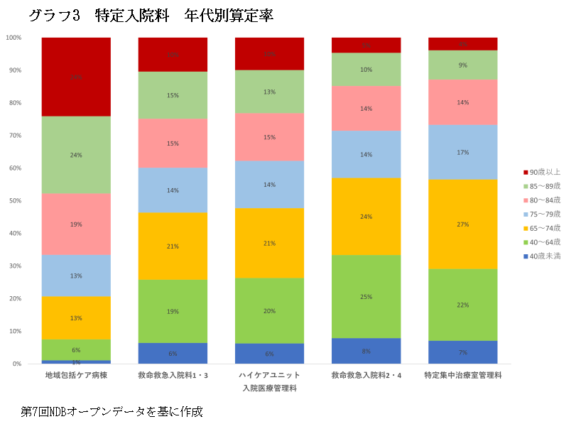 グラフ3は、幾つかの特定入院料について年代別の算定率を見たものであり、地域包括ケア病棟では75歳以上で約8割、80歳以上が約3分の2を占める状況にある。