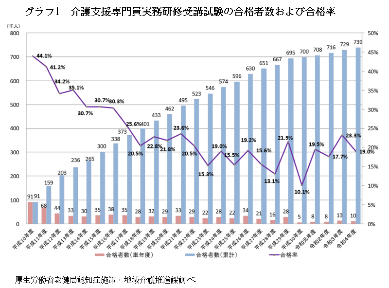 厚生労働省によれば、介護支援専門員実務研修受講試験(以下、試験)の合格者の累計数は、2022年度試験をもって73万9000人に上った=グラフ1=。