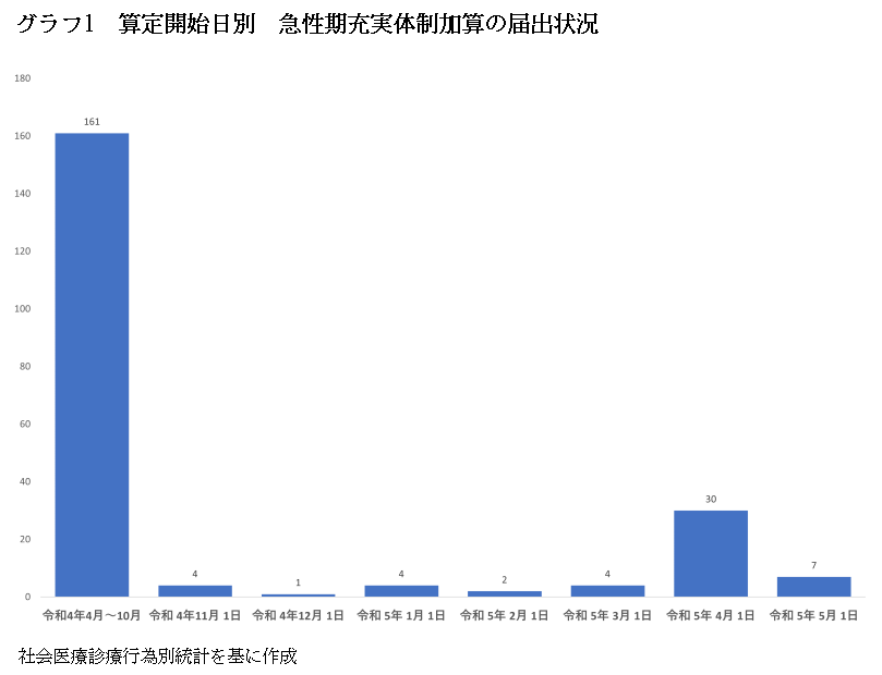 グラフ1は、急性期充実体制加算の届け出病院数を算定開始日別に見たものであり、23年6月1日現在で(東北厚生局のみ5月1日現在)、既に213病院が届け出ている。