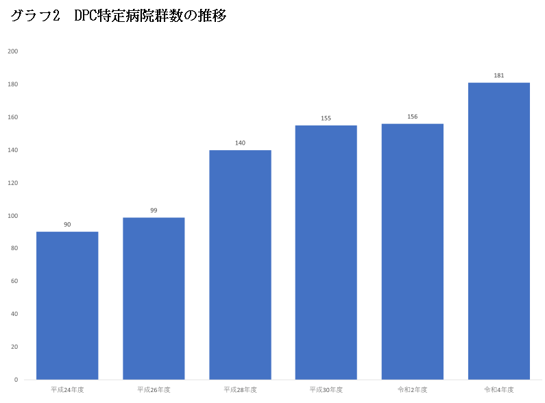 22年10月1日時点では161病院だったので、約半年で52病院が届け出たことになる。今後も虎視眈々と当該加算の届け出を目指している病院が多数あるわけで、このままでいくと300病院を超えるのも時間の問題だろう。DPCの特定病院群も増加傾向にあるが現在181病院であることからすれば、想定の範囲外に増加しつつあるという捉え方もあるのかもしれない=グラフ2=。