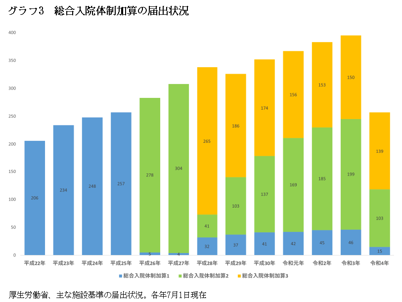 なお、これに伴い総合入院体制加算の届け出病院数は連載第168回で予想した通り減少しており、特に総合入院体制加算1・2の病院が急性期充実体制加算にランクアップしたものと予想される=グラフ3=。