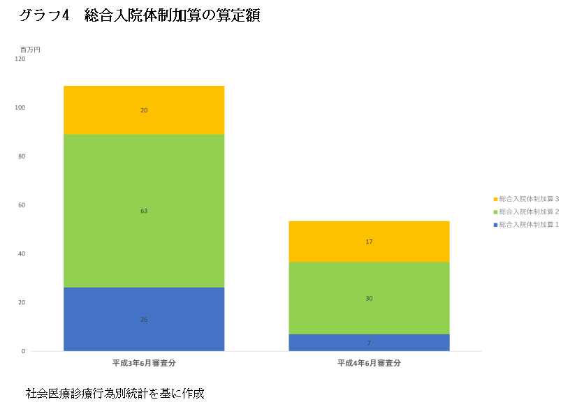 当然これに伴い総合入院体制加算の算定額も減少したわけであり、社会医療診療行為別統計によると21年6月から22年6月審査分に向けておよそ半額となっている=グラフ4=。