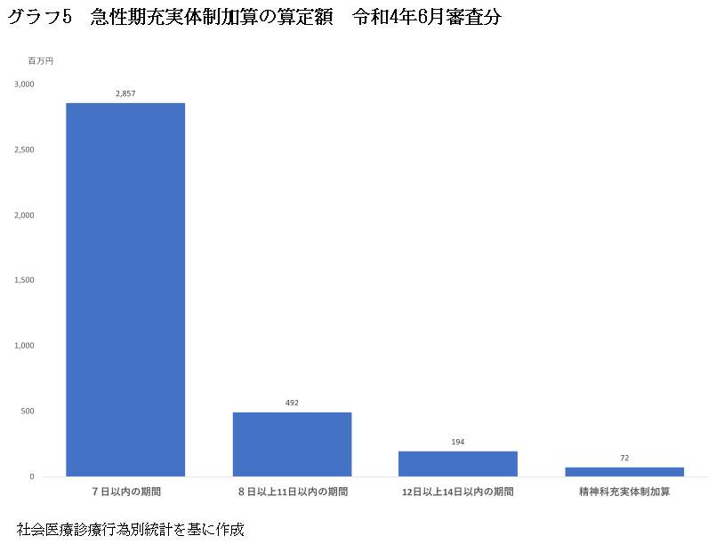 一方で、急性期充実体制加算は22年6月審査分で36億円を超える額が算定されており、高度急性期病院に対する手厚い評価が行われたことになる=グラフ5=。