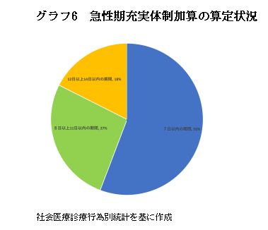 特に7日以内の算定が全体の56%を占め、入院初期の点数を高く評価し、DPC/PDPSでも出来高算定とするなどの在院日数短縮のインセンティブが有効に機能したともいえるだろう=グラフ6=。