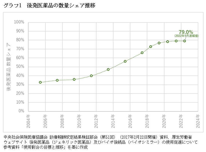 少子高齢化が進む環境下、限られた医療財源を効率的に活用するため、政府は後発医薬品の使用を推進してきた。具体的には、「経済財政改革の基本方針2007」において、12年度までに後発医薬品の数量シェア30%以上(先発品も含めたシェア)を達成する目標が設定された。その後、段階的に目標数値が引き上げられ、「経済財政運営と改革の基本方針2015」では17年央までに70%以上(後発医薬品に置き換え可能な医薬品における後発医薬品のシェア。以降、後発医薬品の数量シェアはこの数値を指す)とするとともに、18年度から20年度末までのなるべく早い時期に80%以上を目指すこととされた。「経済財政運営と改革の基本方針2021」では、全ての都道府県で23年度末までに80%以上にすることとされた。