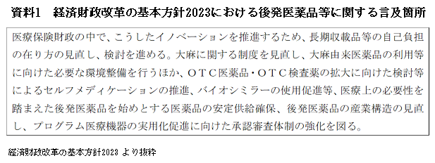 これらを踏まえ、23年6月16日に閣議決定された「経済財政運営と改革の基本方針2023」において、後発医薬品などに関する方針が示された=資料1=。