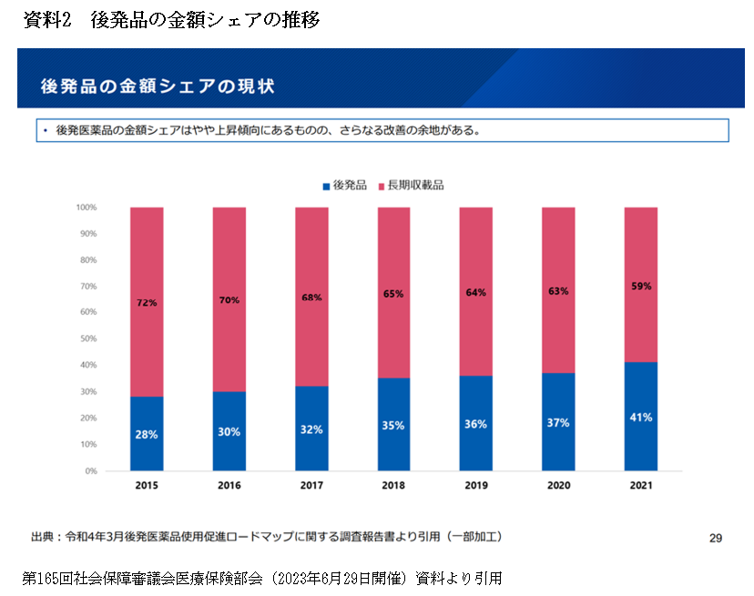 また、同基本方針2023の注記で、「後発医薬品への置換えは数量ベースで約8割に達しようとしているが、金額ベースでは約4割と諸外国と比較しても低い水準」と言及され、6月29日の社会保障審議会医療保険部会において、金額ベースのシェアが4割程度であるとの資料が示された=資料2=。