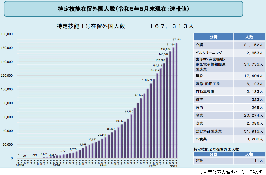 入管庁によると、5月末の特定技能1号の在留外国人数(速報値)は全分野で16万7,313人となり、このうち介護分野は2万1,152人だった。前回公表した3月は1万9,516人で、初めて2万人台に乗った。1万411人だった2022年6月末から1年弱でおよそ2倍となった。