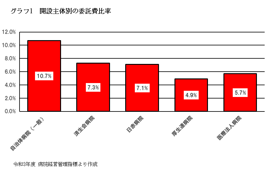 病院の開設主体別に見た業務委託比率の割合を示します=グラフ1=。