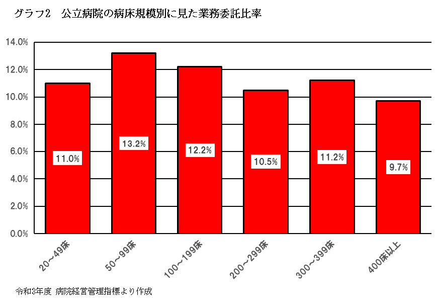 自治体病院(一般病院)での業務委託比率が、他の組織形態の病院に比し、際立って高いことが分かります。自治体病院(一般)の病床規模別に見た業務委託費比率の割合ですが、病床規模が小さいほど、委託費比率の割合が高くなっています=グラフ2=。