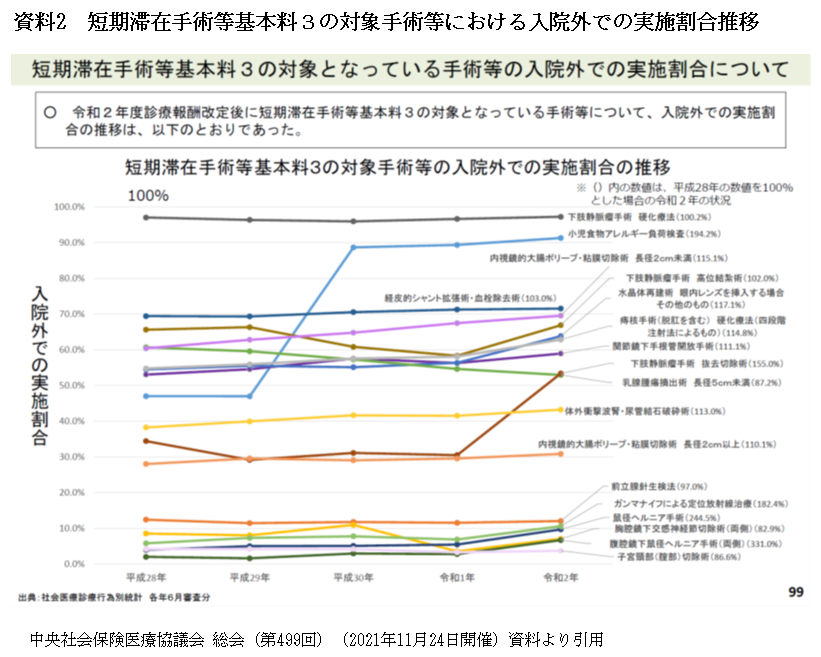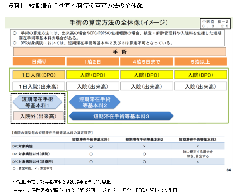 診療報酬において「短期滞在手術等(日帰り手術,1泊2日入院による手術及び4泊5日入院による手術及び検査)を行うための環境及び当該手術を行うために必要な術前・術後の管理や定型的な検査,画像診断等を包括的に評価したもの」※とされている短期滞在手術等基本料は、基本料3の4泊5日まで金額が変わらない点に代表されるように、在院日数短縮へのインセンティブが設定されている=資料1=。