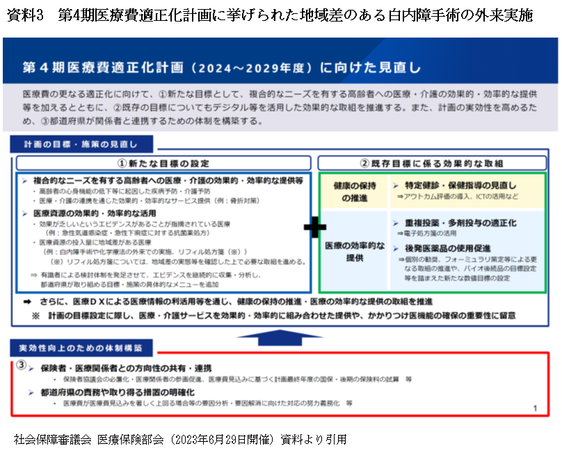 外来機能報告で地域における外来での手術実施状況などが明らかになれば、白内障手術における病院・診療所の役割について機能分担が議論されることも考えられる。また、次期医療費適正化計画で、新たに設定する「医療資源の効果的・効率的な活用、医療資源の投入量に地域差がある医療」の目標の例として、白内障手術の外来実施が挙げられている=資料3=。