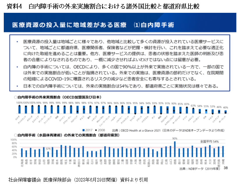 白内障の手術は、経済協力開発機構(OECD)加盟国では外来実施割合100%の国が多いのに対し、日本は5割強にとどまっている。また、徳島県のように90%と高い地域がある一方で、福島県は32%と低く、地域により大きくことなることが示されている=資料4=。