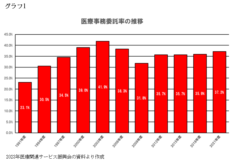 医療関連サービス振興会の調査によれば、医療事務委託率は1991年度の23.1%より年々増加し、ピーク時の2003年度には41.9%に達していましたが、現在は30%後半が続いています=グラフ1=。 (残り3678字 / 全4826字) 次回配信は8月4日5:00を予定しています