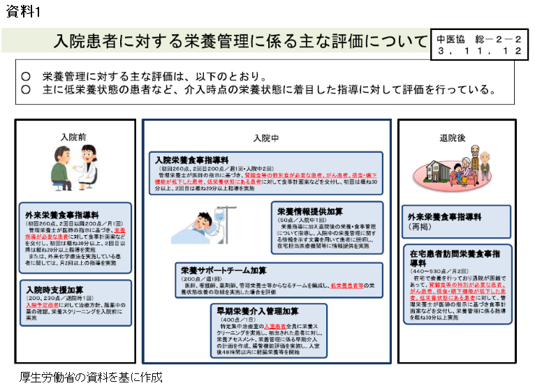 病院に勤務する管理栄養士の業務は、これまでは入院患者に対する給食管理が主でありました。近年は入院患者に高齢者が多く、さらに悪性腫瘍の患者が増え、入院中の栄養管理業務が増加し、診療報酬制度においても入院栄養食事指導を中心に、これらの業務が高く評価されるようになってきています=資料1=。そこで、これらの業務を充実させていくために管理栄養士の増員が必要になってきています。