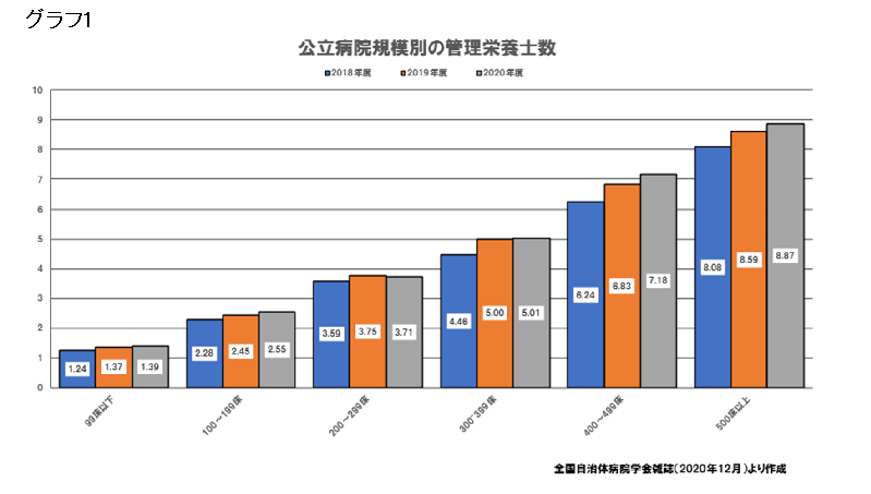 公立病院における管理栄養士の数を見ると、400床以上の病院では、近年増員が見られますが、400床未満の病院では、増加は見られていません=グラフ1=。