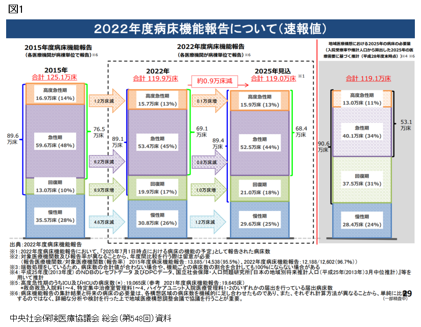 図1は、地域医療構想における機能別の必要病床数の推計と病床機能報告の状況であり、やはり急性期が過剰で回復期機能が過小であるという状況が示されている。