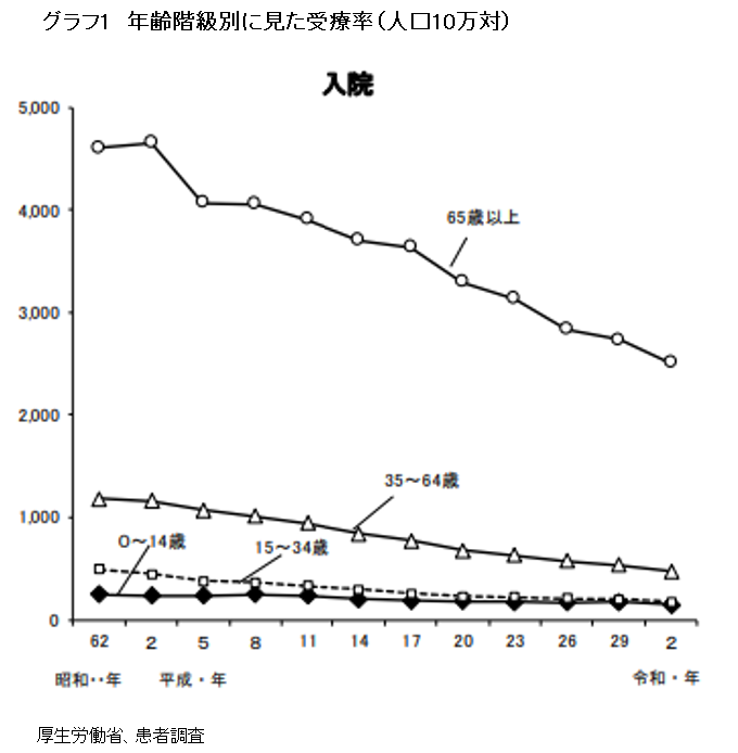 ただ、この必要病床数は本連載でも繰り返し述べてきたが、2013年の受療率を基にしており、その後、受療率が一貫して低下している状況からすると、そもそもこれだけの病床は不要なのだと考えるべきだろう=グラフ1=。