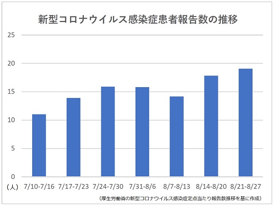 厚生労働省は1日、新型コロナウイルス感染症の発生状況を公表した。第34週(8月21-27日)の定点医療機関当たりの新規患者報告数は、前週比6.9%増の19.07人で、2週連続で増加した。28都府県で前週の報告数を上回った。【新井哉】