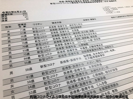厚生労働省は、疾病・障害認定審査会感染症・予防接種審査分科会の新型コロナウイルス感染症予防接種健康被害審査第二部会(8月31日開催)の審議結果を公表した。新型コロナワクチンを接種した252件について、予防接種と疾病・障害などとの因果関係を審議した部会は、210件を認定、34件を否認、8件を保留とした。【新井哉】