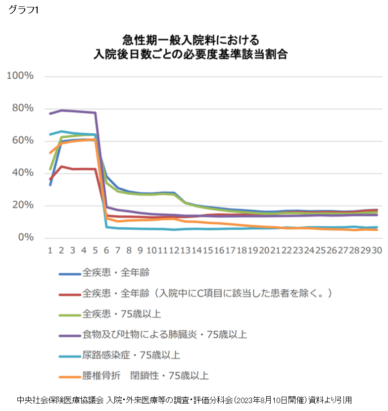 入院初日から5日目までの看護必要度が高く、6日目以降は大きく低下している。急性期一般入院料の基準が20-30%前後であることを踏まえると、入院初期の患者でベッドを埋めることの重要性が明確に分かる。また6日目以降の看護必要度を見ると、C項目に該当した患者を除いた折れ線(赤)や、誤嚥性肺炎(紫)、尿路感染症(水色)、圧迫骨折(橙)など入院中に手術をしない患者の割合が高い疾患の折れ線は、全疾患・全年齢(青)や全疾患・75歳以上(緑)より低いことが分かる。