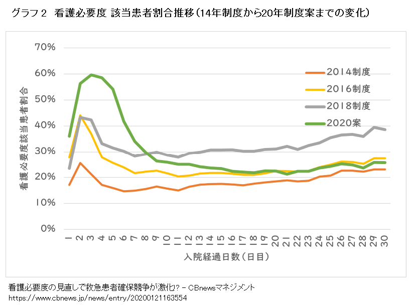 このように入院経過に応じた看護必要度の該当患者の割合推移を見ることにより、その時々の評価制度の特徴や疾患の特徴を理解しやすい。例として以前の拙稿から2つのグラフを紹介する。14年度制度から20年度制度までの改定について、同じ患者データを用いて該当患者割合の変遷を見ることにより、改定のたびに入院初期の評価を上げていったことが分かる=グラフ2=。