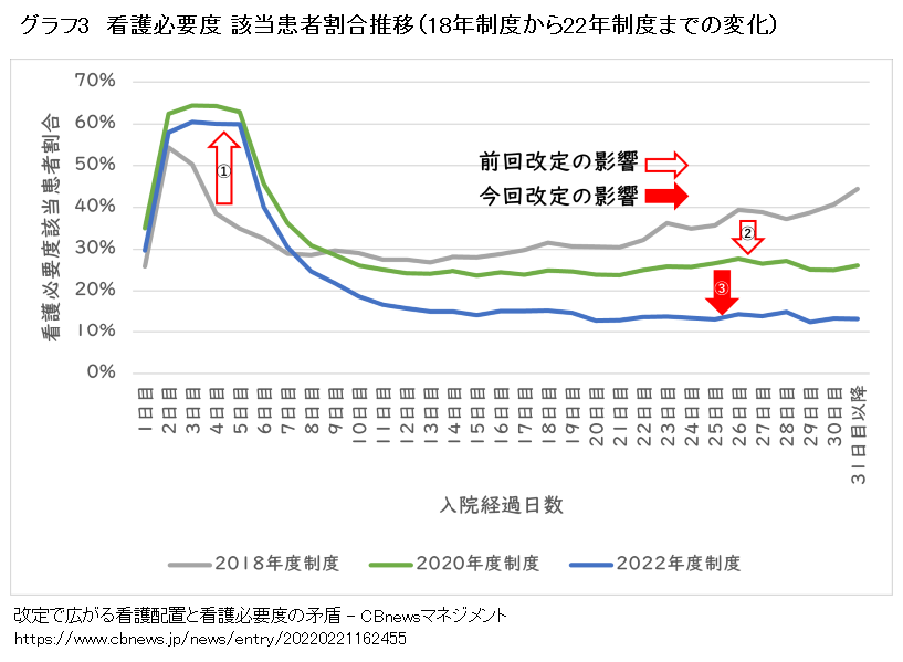 また、18年度制度から現行の22年度制度までの変遷を見ると、入院後半の評価が下がったことが分かる=グラフ3=。
