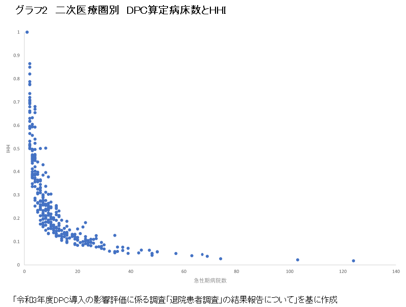 グラフ1は二次医療圏別に横軸にDPC算定病床数を縦軸にHHIを取ったものであり、全国全ての二次医療圏がプロットされている。右下ほど競争が激しく、左上ほど寡占状態ということになる。
