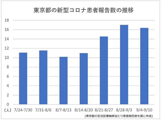 東京都は14日、新型コロナウイルス感染症のモニタリング分析を公表した。専門家による分析では、増加傾向だった定点医療機関当たりの患者報告数が「横ばいとなった」と指摘している。【新井哉】