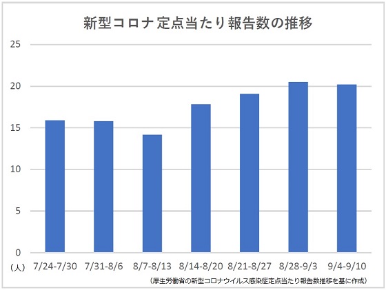 厚生労働省は15日、新型コロナウイルス感染症の発生状況を公表した。第36週(4-10日)の定点医療機関当たりの新規患者報告数は、前週比1.5%減の20.19人だった。これまで3週連続で増加していたが、横ばいとなった。【新井哉】