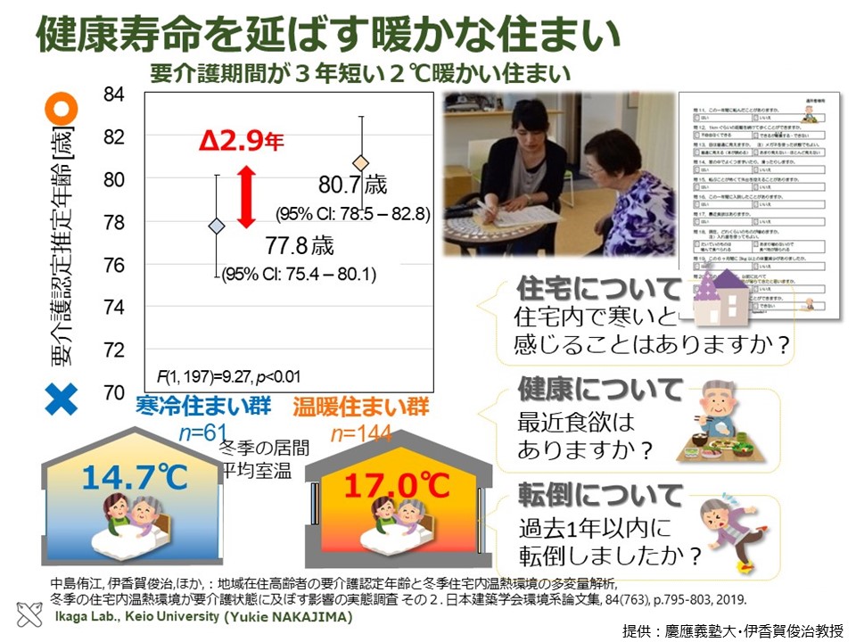 あります。高齢者約200人を対象に要介護認定の推定年齢に関する調査を行い、冬場の居間の室温に注目して、平均15度の住まいと17度の住まいを比較しました。