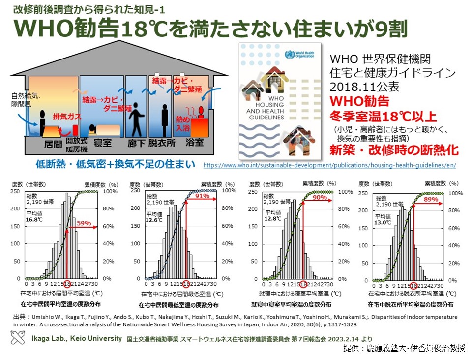 少ないです。WHOでは、健康のために冬季の室温を18度以上にすることを、新築・改修時の断熱化と併せて世界各国に勧告しています。しかし調査の対象となった約2,200軒のうち、冬場の平均室温が18度を満たさない家が9割もありました。